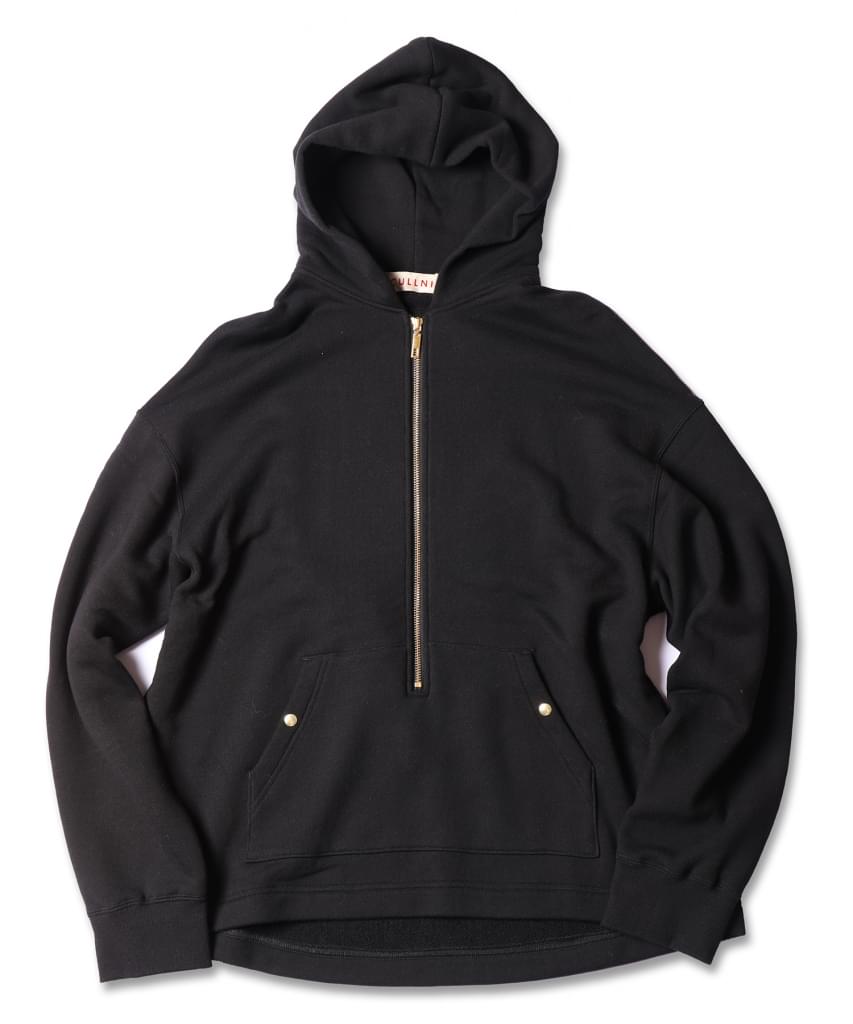 ゴールドのアクセントが目を引くハーフジップパーカー。